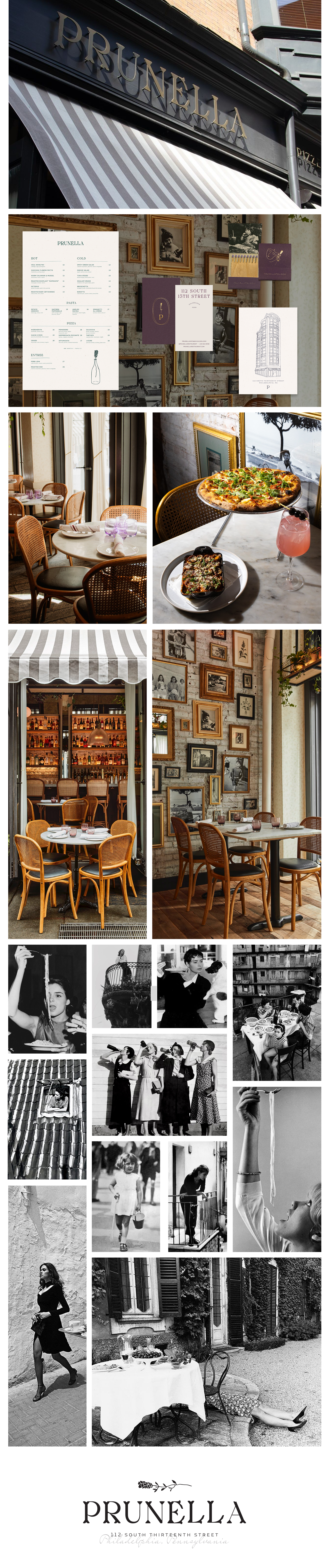 Prunella is a 13th Street restaurant located in Philadelphia. The concept was rooted in Tuscan folklore, drawing quiet inspiration from the tale of Prunella, a resilient and spirited heroine whose story carries themes of sweetness, endurance, and transformation. Rather than retelling the narrative, we channeled the essence of this feminine character to shape Prunella as an entity that feels romantic, resourceful, and quietly powerful.